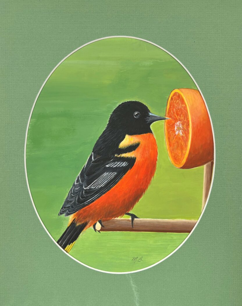 Fredonia-based artist Margaret Braun has a deep appreciation for the comfort and joy that birds add to our lives. Braun’s love of birds is apparent in the care with which she portrays them in her art, most of which are paintings on round glass ornaments. Braun’s lively portraits of birds emulate the sophisticated design of Art Nouveau style. With elegant curves, sinuous lines, and floral motifs, Braun creates for us a graceful visual rhythm. Referencing the ways which birds have inspired countless artists, Braun channels the bird as muse, capturing for us the essence of their beauty.