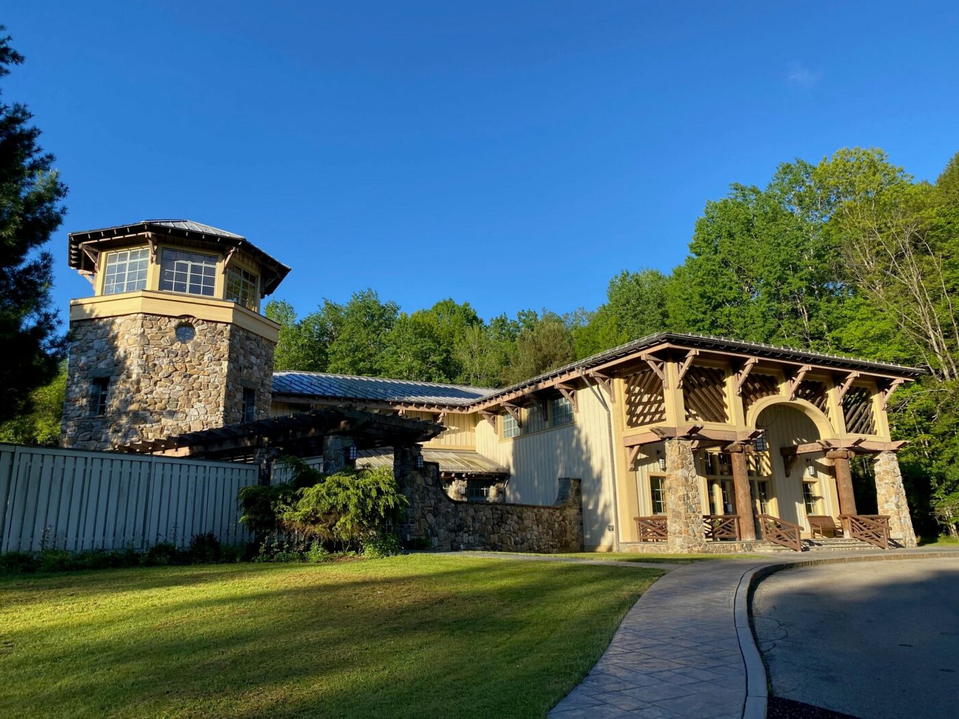 “The octagonal tower, the loggia, and the brackets supporting the extensive projecting roofs are by contrast dramatically Romantic and are derived from the Picturesque houses of John Nash in the early 19th-century England, a style represented in America by the work of Andrew Jackson Downing. These details also reveal the influences of the Ahwahnee Hotel in Yosemite, a majestic, superbly crafted stone and timber lodge designed and build in the 1920s by Gilbert Stanley Underwood.
