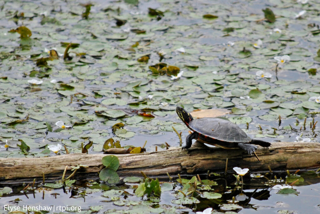 There’s plenty of life in the pond that we can’t see, from tiny invertebrates to painted turtles. Sometimes, the trick to finding wildlife is just to know where to look. On warm sunny days, painted turtles love to sunbathe on the edge of the pond, and sometimes you can see their shells poking out of the water.